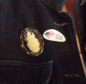 Proudly wearing my “I voted early” sticker next to the wicked cool cameo my friend Z got me.