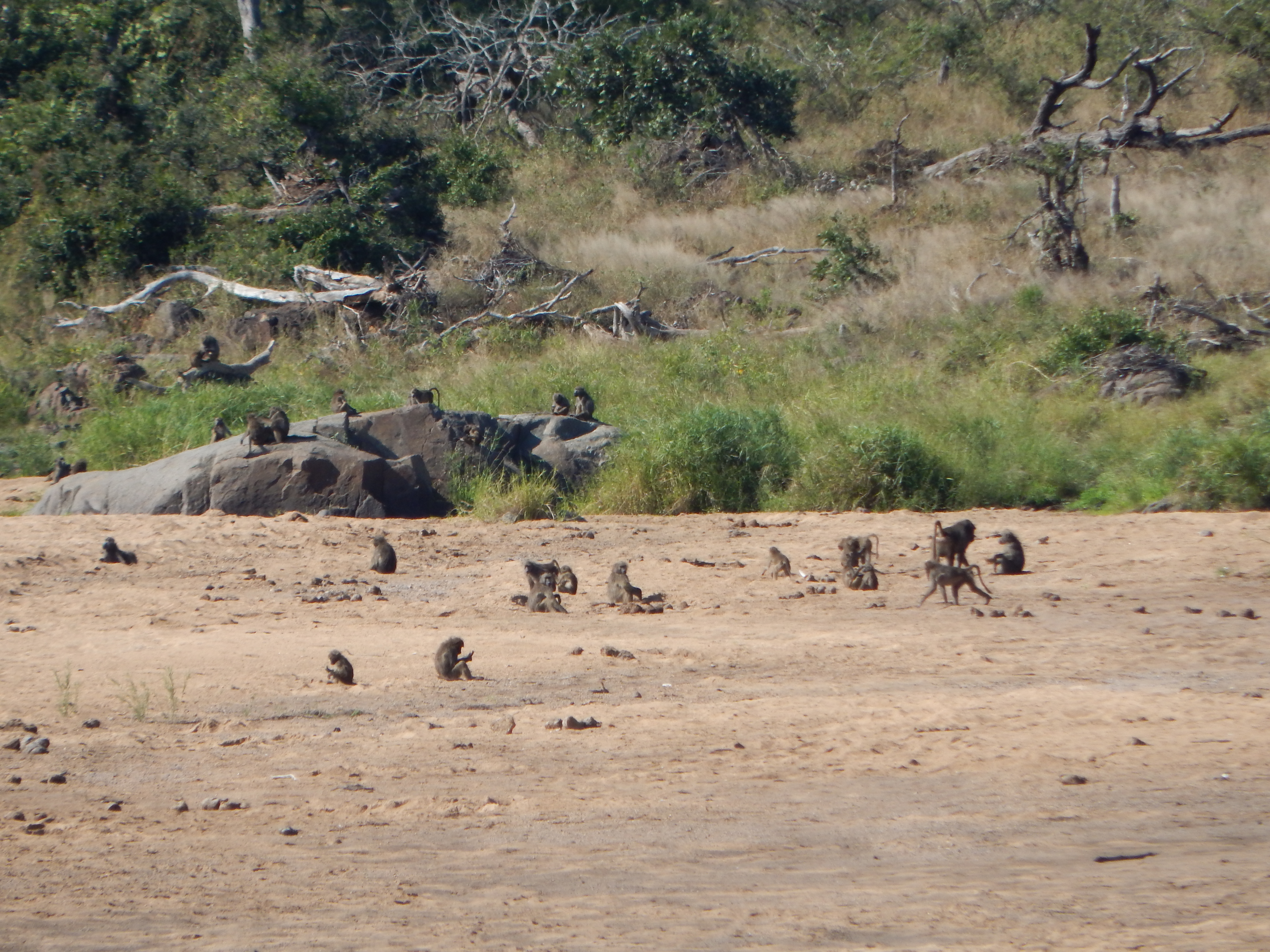 After our insectile friend left us, we drove through a dry riverbed at one point (yes, still on the road) and saw some more baboons: