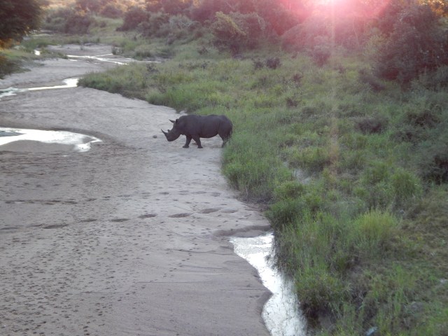 After a little more caffeine (we needs it, precioussssss), we hopped into the back of an opensided megajeep sort of truck, with a few other tourists, for a sunset game drive. Not far beyond the Satara gate, our guide spied a rump. A rump! A rhino rump!