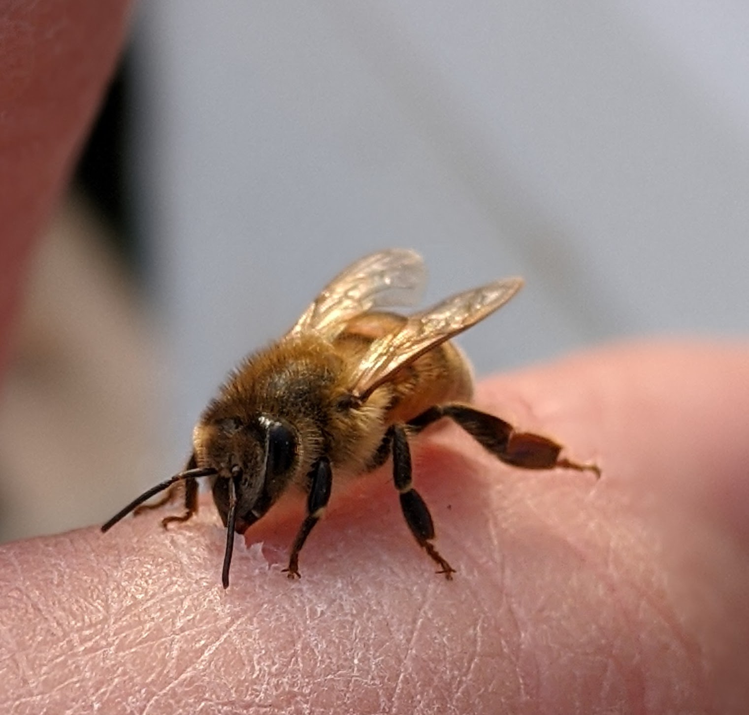 One of my bees, investigating a healing paper cut on my thumb. Isn’t she beautiful?
